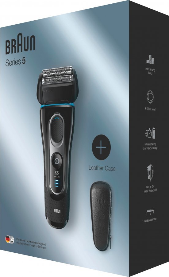 Gift pack sisältää nahkaisen matkakotelon! Braun Series 5 5147s parranajokone. Wet&Dry, voit käyttää myös suihkussa, ajaa geelillä tai vaahdolla. Braun Series 5 parranajokone onnistuu siinä, missä muut epäonnistuvat. Maksimaalista suoritustehoa ja mukavuutta iholle. Myös ongelma-alueilla. Kone tarjoaa ainutlaatuisen yhdistelmän tehokkuutta ja tarkkuutta, mahdollistaen täydellisen suoritustehon ihon mukavuudesta tinkimättä. Uuden FlexMotionTec-tekniikan ansiosta ihokontaktia on ongelma-alueilla huomattavasti entistä enemmän, mikä takaa tehokkaan ajon vähemmällä paineella. Uusi PowerDrive tuottaa 20 % aiempaa enemmän moottoritehoa ajaen tiheänkin parran tehokkaasti. Kaikki Series 5 -parranajokoneet on valmistettu kokonaan Saksassa. Niissä yhdistyvät kehittynein tekniikka ja muotoilu. Laitteissa on ergonominen muotoilu, tyylikäs mattainen metalliväri ja huippuluokan nestekidenäyttö. – Flex MotionTec – teknologia ajaa tehokkaasti vähemmällä paineella, minimoiden ihoärsytyksen. – MicroMotion – Terien itsenäinen jousitus reagoi jopa kasvojen jyrkkiin muotoihin ja ohjaa automaattisesti MacroMotion-järjestelmää. – MacroMotion – 40 astetta kääntyvä ajopää liikkuu vaivatta kasvojen loivemmilla muodoilla ja takaa maksimaalisen ihokontaktin. – Ultra ActiveLift – Patentoitu teknologia nappaa tehokkaasti ongelmalliset karvat erityisesti kaulan ja leuanalueelta. Ainutlaatuinen pyörivä leikkuri nostaa ja leikkaa ihonmyötäiset karvat vähemmillä vedoilla. – CrossHair – terä antaa tarkan lopputuloksen, joka kestää. Nappaa eri suuntiin kasvavat uppiniskaiset karvat ja jopa lyhyimmän sängen. – Uusi PowerDrive leikkaa tiheänkin parran tehokkaasti. 20 % tehokkaampi moottori mahdollistaa riittävän väännön maastosta riippumatta. – Wet & Dry, – Viiden asteen akkunäyttö, joka varoittaa alhaisesta latauksesta, matkalukon sekä hygieenisyystason osoittimen – Vedenkestävä 5 metriin saakka ja täysin vesipestävä. – Uusi MultiHeadLock – Series 5-parranajokoneessa on järjestelmä, joka antaa lukita ajopään manuaalisella valinnalla viiteen eri kulmaan – Ihoystävällinen parranrajausterä viiksien ja pulisonkien tarkkaan muotoiluun. – Tehokas ladattava litiumioniakku – Täysi lataus tunnissa, jopa 45 minuuttia johdotonta ajoaikaa – Pakkauksen sisältö: New Series 5 – 5147 -parranajokone, matkapussi, suojus, SmartPlug ja puhdistusharja