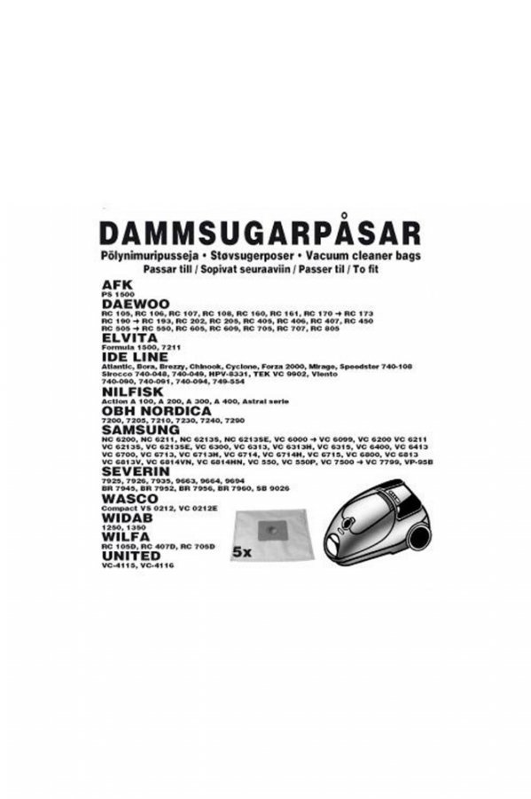 AFK PS 1500 Daewoo RC105 Elvita Formula 1500, 7211 Ideline Nilfisk Action A100 A200 A300 A400 Astral sarja OBH NORDICA 7200 7205 7210 7230 7240 7290 Samsung NC6200 Severin 7925 Wasco Coompact Wilfa RC105D RC407D RC705D United VC-4115 VC4116 Contact