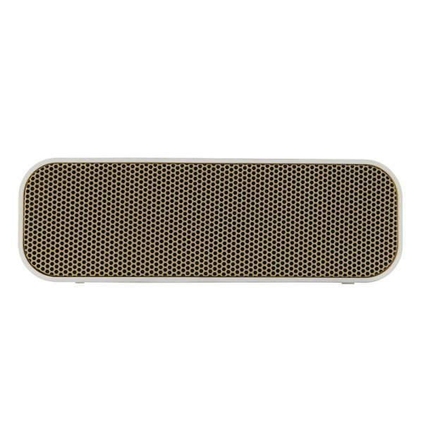 Moderni Kreafunk kaiutin. Kaiuttimessa kultainen etuosa jonka vuoksi tuote sulautuu helposti sisustukseen. Pienen koon ansiosta kaiutin on helppo ottaa mukaan paikasta toiseen. Lataus riittää kokonaisen päivän. Bluetooth, USB, AUX. USB ja AUX-johto sisältyy. Toimitetaan upeassa puulaatikossa.
