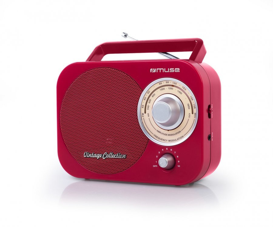 Retrotyyppinen ja kesäisen punainen kannettava radio, toimii verkkovirralla tai paristoilla. FM/MW asemat. Analoginen viritin ja kantokahva, helppo kuljettaa mukana.