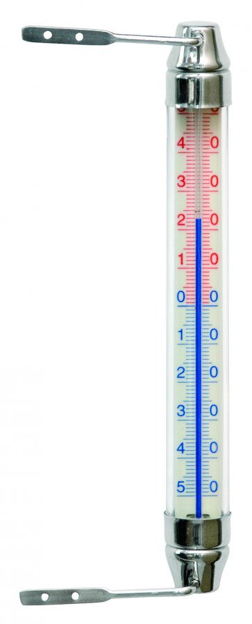 Ulkolämpömittari, jonka päät ovat ruostumatonta terästä. Kiinnitetään ruuveilla ikkunanpuitteeseen. Mittausalue on -50..+50°C.